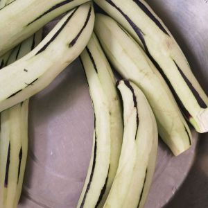 把茄子打皮,然后切成一节一节的,放在锅里蒸5-10分钟