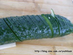 先直刀切,黄瓜片切的越薄越好,因为下面有筷子垫着,不用担心切断。