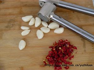将蒜用压蒜器压成蒜末,切的也可以,辣椒切成小段。