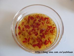 令拿一个碗,放两勺白糖一勺醋,放少量味精,将炸好的辣椒油倒在碗里,搅拌均匀成调味汁。