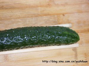 将黄瓜放到案板上,底下垫上筷子(如果你手艺相当好也不用垫筷子,只要你保证不切断了就好)。