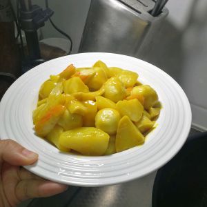 黄油完全融化后倒入土豆块翻炒三分钟,一定要中小火,防止土豆粘锅
