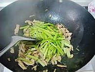 锅内放油,热后放蒜片和姜丝爆香。放入腌制好的肉丝翻炒。