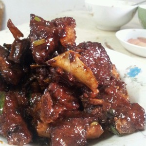 锅内放油,中小火煎排骨,煎至两面焦黄至焦糖色后装盘待用。