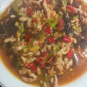 放木耳和青椒快速翻炒,最后倒入芡汁炒匀