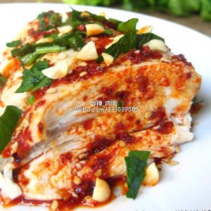 将红油、香油、生抽、糖、盐、白芝麻、花生碎调汁,浇在鸡块上,撒葱花、香菜
