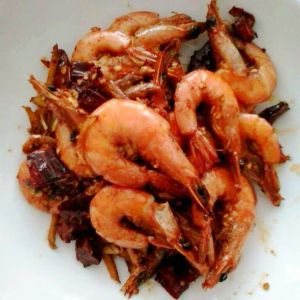 倒入炸好的虾子,加盐,生抽调味后,放少许矿泉水煮开后,大火收汁即可。