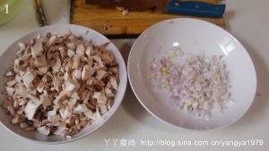 蘑菇洗干净切成碎小颗粒,洋葱切碎粒。