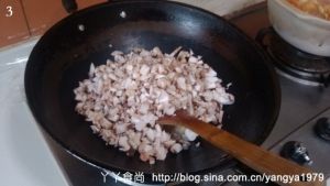 加入洋葱和蘑菇碎粒翻炒出香味。