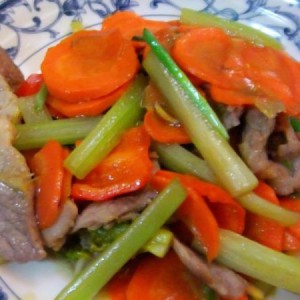 油锅烧热,蒜末煸油爆香,倒入胡萝卜、西芹、加少许生抽、料酒翻炒2分钟后,加少许盐、水继续炒2分钟,最后倒入瘦肉片,炒2-3分钟即可出锅。