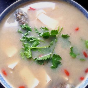 现在鱼汤已经很白了,倒入豆腐、枸杞和盐,再炖10分钟。