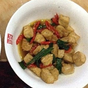 把豆腐切成丁。辣椒切斜块。大蒜切段。