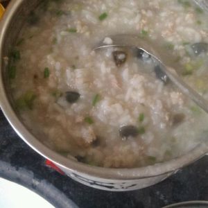 粥煮好后先放肉, 不停的搅动把肉散开, 肉熟以后加入皮蛋搅动半分钟至一分钟放适量的盐, 起锅是加入少许葱 ,美味的皮蛋瘦肉粥就做好啦!