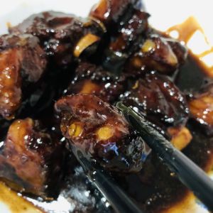 炸好后,把刚才腌制酱汁里的葱段、姜丝扔了,酱汁继续倒入锅中。再根据个人口味放醋、白糖。如果锅内汤汁少,可以倒入一些开水,必须要没过小排