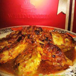 锅中底油烧至7成热,下入葱姜蒜末爆锅,加入豆豉和胡萝卜末炒香,加生抽、黄酒、盐、味精、糖炒至收汁粘稠,将茄子放入汁中翻炒一下即可出锅。