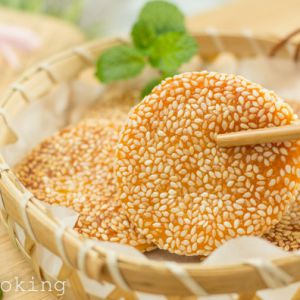 把南瓜面团分成一个个大小尽量一样的小面团,搓圆,放在白芝麻里,压平,让饼胚两面均匀的沾上白芝麻。