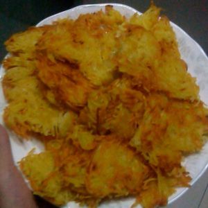 把土豆切成丝状,加鸡蛋,做成饼状,