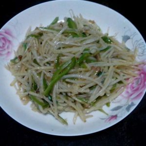 土豆切或刮成丝,然后放入冷水简单淘一下,营养有些损失,但是鱼和熊掌不可兼得,为了俺的舌头,口感好哦