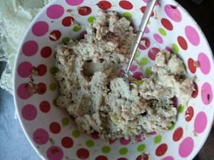 香菇 豆腐 肉都切末。放入葱花,姜粉 料酒 盐 胡椒粉 少许生抽拌匀