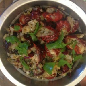 锅中油烧热后,将切好的葱姜蒜一同下锅煸炒(中火),出香味后,将挑出的虾油入锅翻炒一分钟,之后倒入洗净的龙虾尾翻炒,炒得虾变红色后,倒入一碗清水与虾持平,加入酱油、盐、料酒,开锅后,转小火慢炖收汁即可。