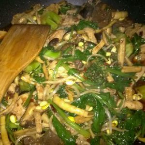 热锅凉油,油热后放入花椒,出香味后依次放入葱姜蒜,爆香后放入酱料包,翻炒出香味儿,先放入鸡肉,变色后放入鸭血,竹笋,翻炒一会儿放入剩余所有蔬菜,等入味后即可出锅!