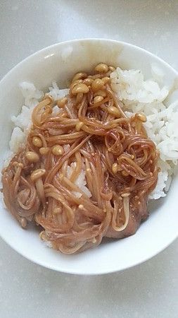 在碗中放入米饭,然后将金针菇和汤浇在米饭上,味道好极啦!