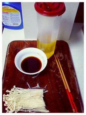 金针菇洗净去根,一品鲜酱油放入料酒和糖,搅拌均匀待用。