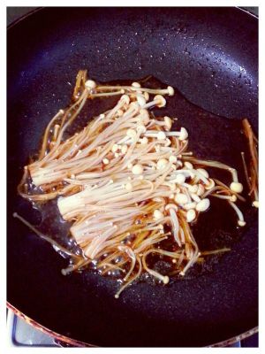不粘锅内放入适量的油,又热后调小火,然后放入调汁,待调汁冒泡泡后,将金针菇放入锅内,翻一翻,待颜色变成焦黄时,就可以关火了。