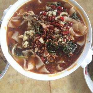 4、水开放小火、下入肉片、划开、肉变色捞出、分别把青菜下入锅里、煮一下、找个大碗、把青菜放进去、肉放进去、水晶粉下锅煮熟、在放入大碗里、放入汤、肉上面放入干辣椒段、花椒麻椒和蒜蓉、另起锅把油烧热浇到上面、好了、可以吃了