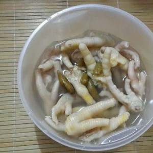 3、洗好的鸡爪,放入滚水中煮沸,最好加一块姜(花椒,料酒)一起煮。