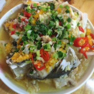 摆盘,鱼头上撒上海南黄辣椒,蒜头,切丝的红辣椒,葱蒜粒,味精,视鱼头大小蒸大概15—20分种即可。我是用这种黄辣椒哦。