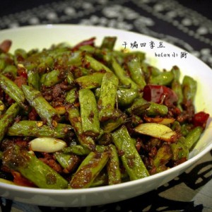 将猪肉用刀剁成猪肉糜,用生抽将猪肉糜拌一拌,锅中少许油5成热,先将花椒,干红辣椒段和蒜瓣放在锅中用油爆香,再将猪肉糜放入锅中炒变色,这个时候将炸好的四季豆也放入锅中放翻炒。