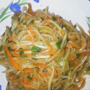 把芹菜在开水锅里煮一下如果用香菜就不需要煮了,煮好后切丝