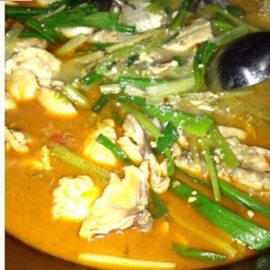 然后放入鱼片,开了即可关火,撒上大蒜,芹菜。