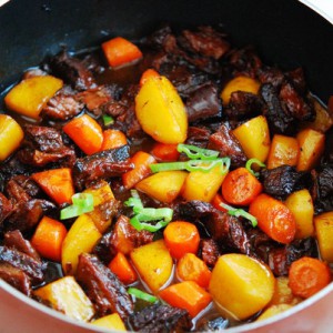 牛腩炖好后,锅中汤水也蒸发了大半,加入煎炒好的土豆块和胡萝卜块,适量加盐,一起用小火焖20分钟。