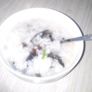 米饭加适量水 倒入腌好的肉丝 木耳 加入适量的盐 鸡精 酱油 蚝油 开火煮至开锅倒入皮蛋少许葱花 再煮2-3分钟即可