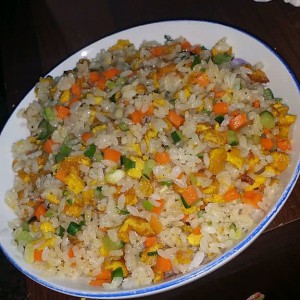 最后把胡萝卜,黄瓜,鸡肉肠,鸡蛋,隔夜饭倒入锅中煸炒放入盐,炒匀