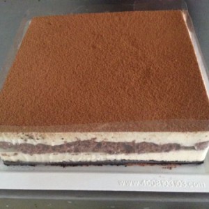 再巧克力蛋糕胚上再倒入剩下的奶油部分,用摸刀抹平!放入冰箱冷藏!4个小时左右!取出后脱膜。