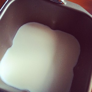 放入面包机内,启动8和面,让牛奶与菌种充分搅拌2-3分钟