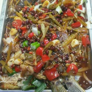 将一条三斤重的锂鱼清洗干净,中间切开分成两半,加料酒,盐,腌制20分钟,放入烤箱上下烤,200度,烤15分钟。取出,洒上花椒粉,鲜辣粉,孜然粉,生姜粉,胡椒粉,鸡精,食用油,红油,蒸鱼豆鼓等,再放入烤箱烤15分钟。