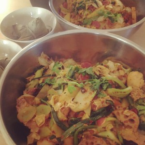把菜倒入锅中进行翻炒,不停的用铲子翻锅底吧。加入王家渡的麻辣香锅底料。加少量开水翻炒入味儿。都炒熟为止。