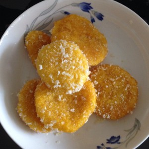 将糯米粉,南瓜片,炼乳,色拉油,入盆中,拌匀,揉成团。