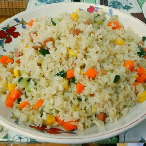 分别将胡萝卜、黄瓜、火腿肠切丁,将玉米剥粒,鸡蛋搅拌均匀,米饭用手将揉开揉到差不多粒粒分离即可
