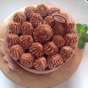 等芝士糊凝固以后脱模,表面撒上可可粉,提拉米苏就完成了,然后在表面做了奶油装饰,还不错吧