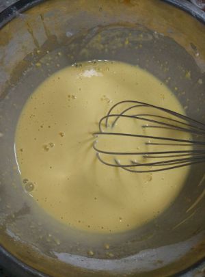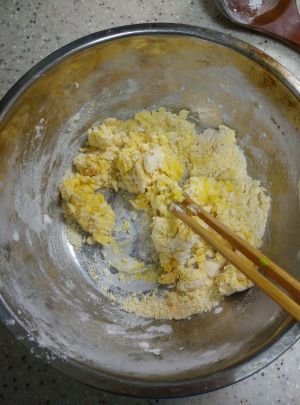 用筷子搅拌,让鸡蛋和面粉混合均匀。