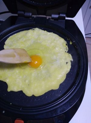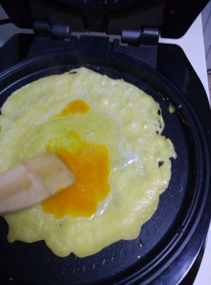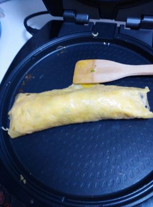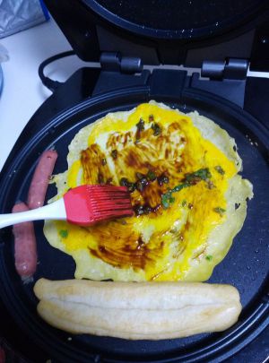 把香肠和油条放在饼的中间,卷起后,蛋饼就好了。