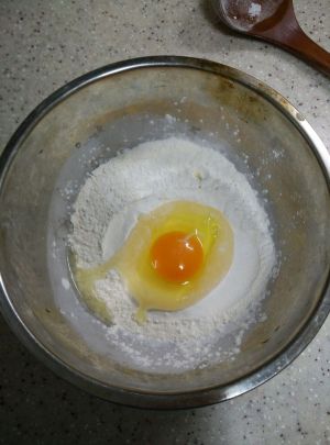 盆里放60克面粉,10克玉米淀粉,再打入一个鸡蛋