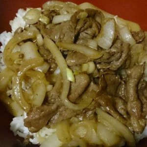 洋葱切细一点,锅内倒入一些油,等油烧热了把洋葱倒入翻炒至洋葱变有点透明,再把肥牛放进去一起炒,加入所有调味料,炒至肥牛刚好熟之后乘起覆盖在米饭上面