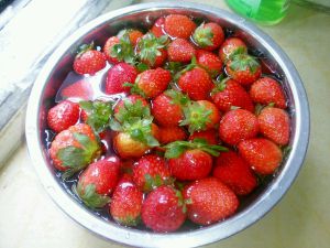 草莓加盐放水里浸泡15分钟,然后去蒂
