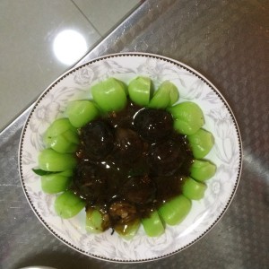 香菇用油炒熟 勾薄芡汁倒入菜好油菜的盘中